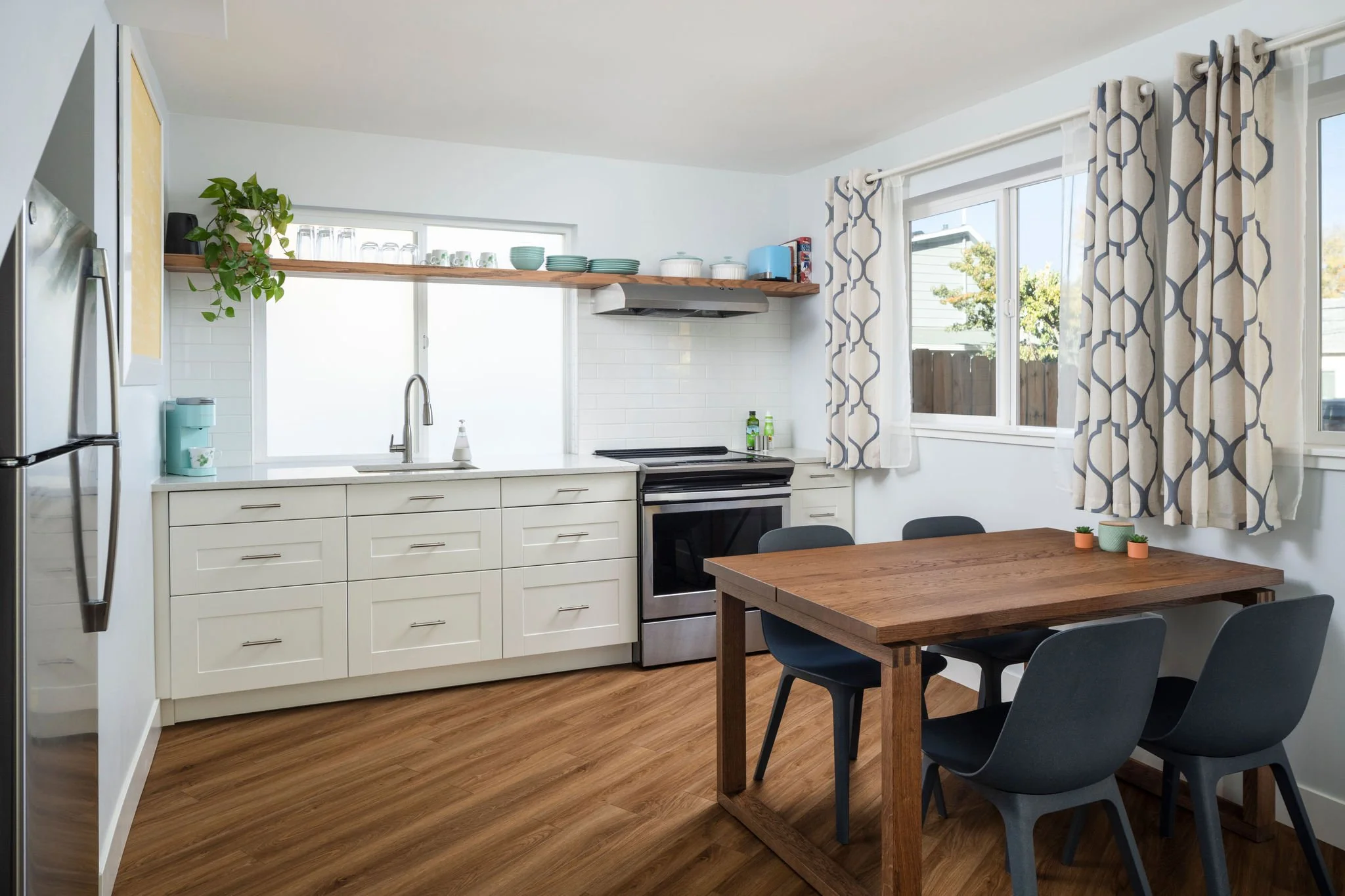 Tucked at the rear of the property, this guest house is a model of creating something beautiful while using cost-effective materials thoughtfully. Additionally, a pass-through window enhances the functional design, fostering a sense of connection and openness within the living space of this cozy abode.